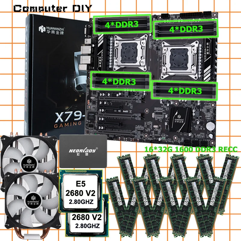 Related Product for and HUANANZHI X79-16D dual X79 motherboard with dual xeon CPU E5 2680 V2 dual CPU cooler 240G SATA SSD memory 256G(16*16G) 1866 RECC